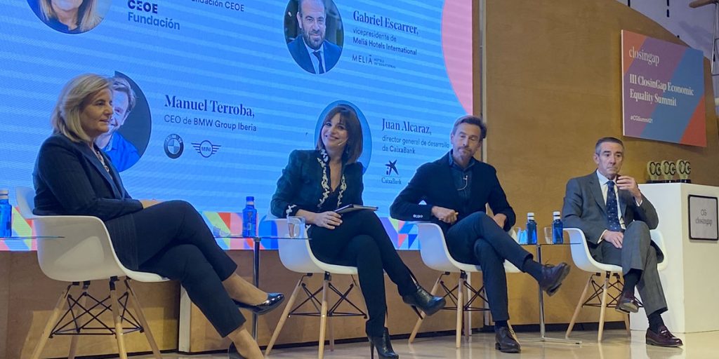 En la última mesa redonda de la jornada, “Fondos de reconstrucción para una España sin brechas”, se ha analizado la oportunidad que representan los fondos europeos NextGeneration para reconstruir la economía y dar a las mujeres un papel preponderante en este nuevo paradigma. Fátima Báñez, presidenta de la Fundación CEOE, ha participado junto a Juan Alcaraz, director general de Negocio de CaixaBank; Gabriel Escarrer, CEO y vicepresidente de Meliá Hotels International y Manuel Terroba, CEO de BMW Group Iberia, han compartido sus impresiones sobre esta cuestión y han coincidido en que olvidarse de situar a la igualdad como uno de los núcleos de los fondos de recuperación sería un error de enormes dimensiones para nuestro país. Asimismo, se han mostrado de acuerdo en que, a través de esta reconstrucción, es posible limitar el coste de oportunidad que supone la falta de paridad para el global de la economía española.